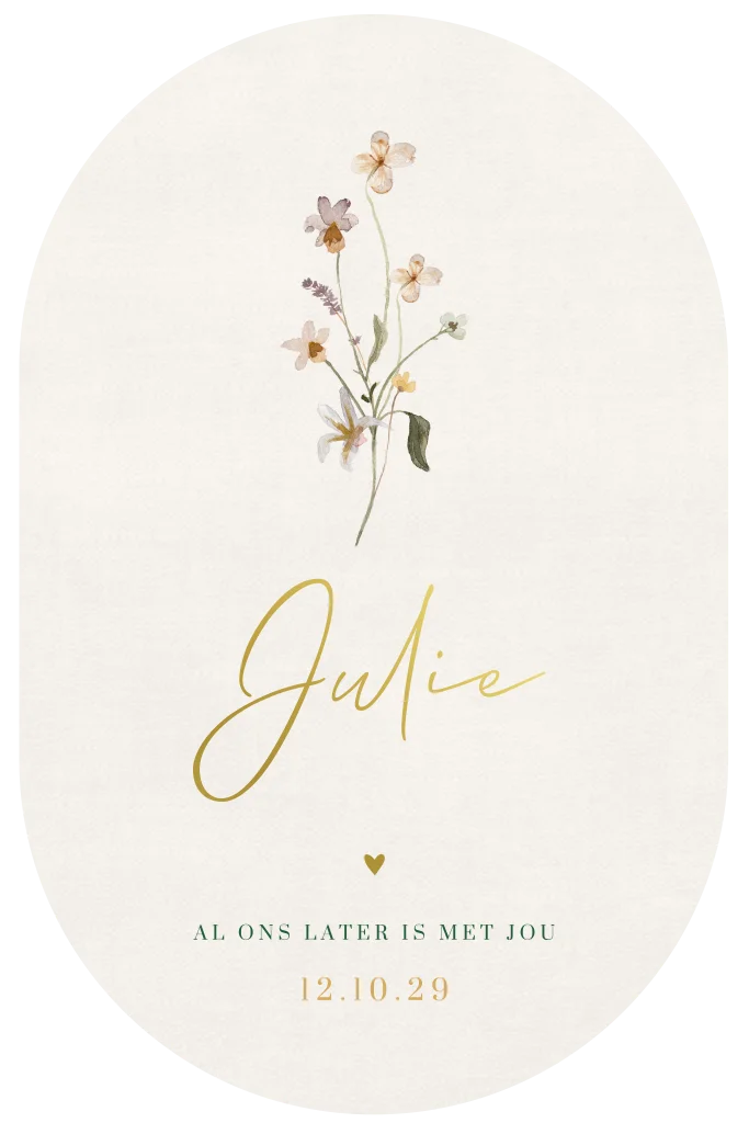 Uniek geboortekaartje voor een meisje in een aparte vorm. Dit romantische babykaartje Julie heeft een prachtige aquarel bloem en is gesneden in een ovale vorm. De lichte, sprankelende goudfolie voor de lichte linnenlook achtergrond, maakt de kaart nóg exclusiever. Kleuren en lettertypes kun je aanpassen in de editor. Hulp nodig? Mail, chat of bel ons gerust.