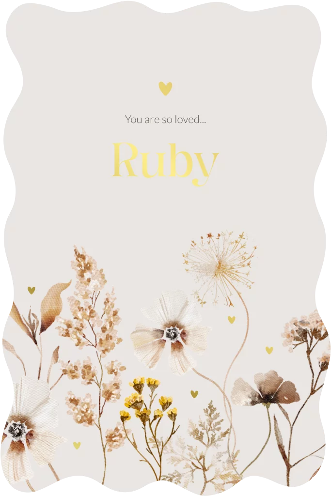Luxe geboortekaartje met golvende randen en foliedruk. Dit geboortekaartje voor een meisje heeft een vrolijke maar rustige uitstraling door de zachte kleuren. De aparte vorm en goudfolie geven een stijlvolle touch aan dit geboortekaartje Ruby. Hulp nodig bij het ontwerpen? Neem contact met ons op!