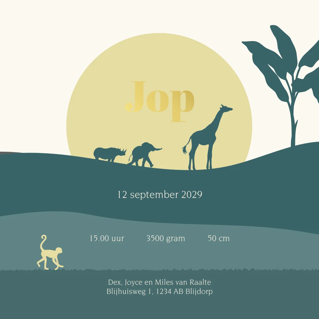 Een schattig silhouet geboortekaartje in jungle sferen voor een broertje. Op dit jongenskaartje Jop zie je twee broertjes die samen met een aapje aan het spelen zijn. Verder zie je een leeuwenwelpje en stokstaartjes naast de jongetjes. Op dit kaartje zie je een ronde uitsnede wat een doorkijkje geeft naar de binnenkant van de kaart. Door het doorkijkje heen zie je de babynaam, een neushoorn, olifant en giraf. Superleuk! Het goudfolie zorgt voor een luxe touch. Teksten, kleuren en silhouetten kun je eenvoudig aanpassen in de editor. Dit silhouet geboortekaartje is ook mogelijk voor een andere gezinssamenstelling.