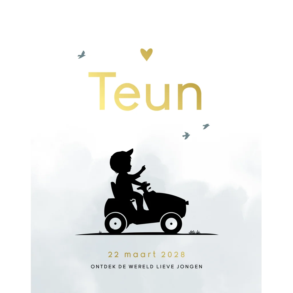 Origineel geboortekaartje voor een jongen in een bijzondere vorm. Deze babykaart voor een zoon is gesneden in de vorm van een boog. Op dit kaartje Teun een silhouet van een jongentje op een tractor met op de achtergrond een blauwe aquarel en enkele vogels. Dit babykaartje heeft een originele en luxe uitstraling door de bijzondere vorm en het gebruik van echt goudfolie. Pas de teksten, kleuren en lettertypes naar je eigen smaak aan in de editor. Ook mogelijk voor een andere gezinssamenstelling. Hulp nodig bij het aanpassen van deze kaart? We helpen je er graag bij!