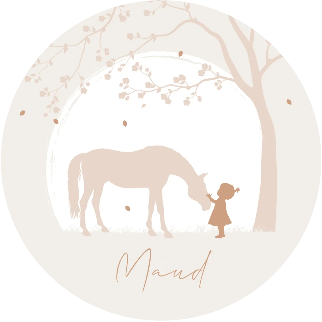 Lief geboortekaartje voor een dochter in een aparte vorm. Deze babykaart is gesneden in de vorm van een cirkel. Op dit ronde silhouet kaartje Maud een herfst tafereeltje met een lief meisje onder een boom met vallende bladeren die een paard aait. Kleuren, teksten en lettertypes pas je eenvoudig aan in onze editor. Hulp nodig? We horen het graag!