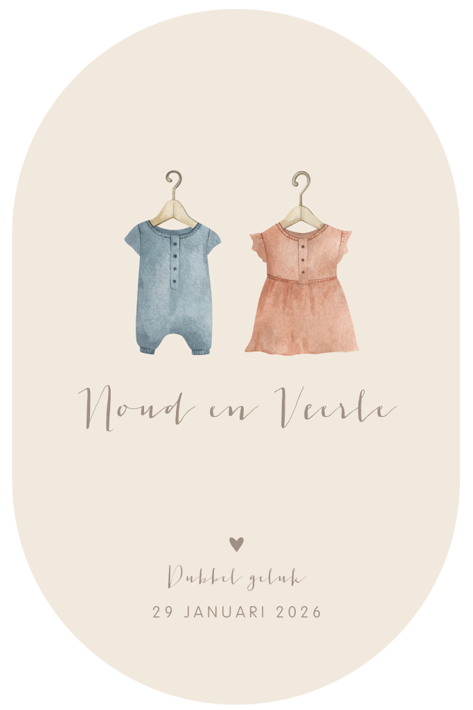 Uniek geboortekaartje in een bijzondere vorm voor een speciaal duo: jullie tweeling! Op dit babykaartje Noud en Veerle twee babypakjes aan een kleerhanger. Dit kaartje voor een jongen en een meisje is gesneden in een ovale vorm. Kleuren, teksten en lettertypes pas je eenvoudig aan in onze ontwerpmodule. Vragen? Bel, mail of chat gerust! We helpen je graag.