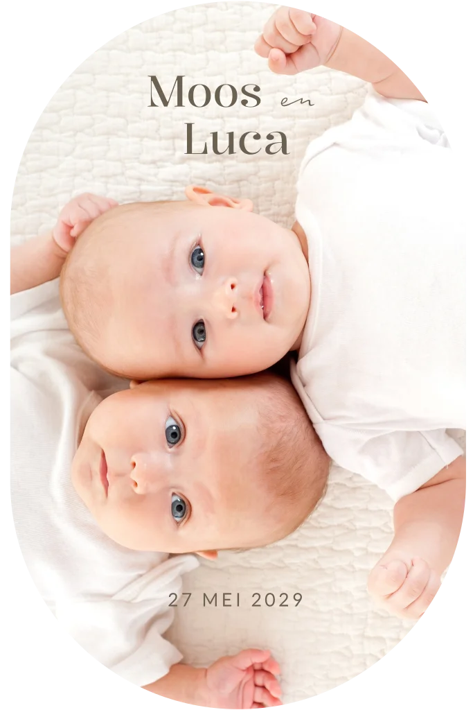 Een tweeling: zo bijzonder! Uniek geboortekaartje voor jullie zoons in een aparte vorm. Dit jongens babykaartje Moos en Luca is gesneden in een ovale vorm. Op deze kaart alle ruimte voor de mooiste foto van jullie tweeling. Teksten, kleuren en lettertypes pas je aan in de editor. Hulp nodig? Laat het ons weten.