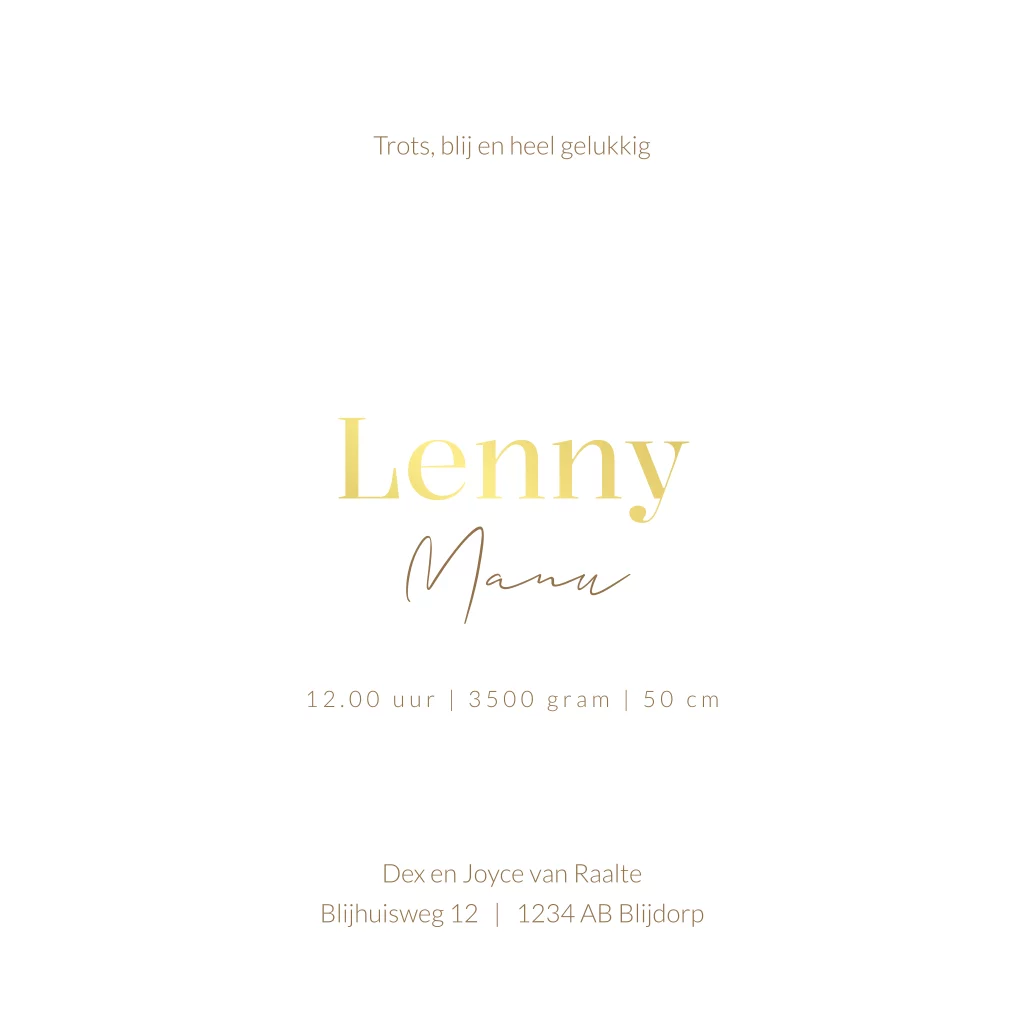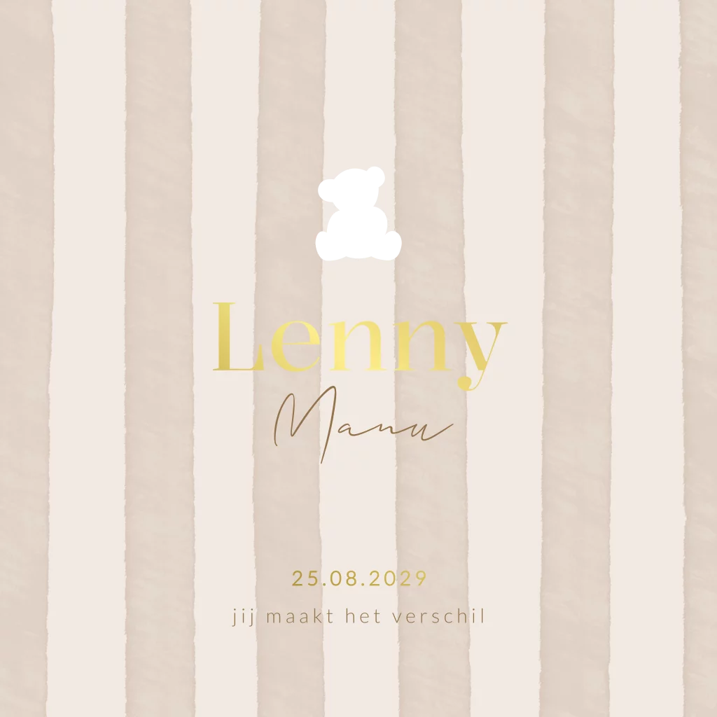 Dit geboortekaartje Lenny is ideaal voor ouders die op zoek zijn naar een unisex ontwerp. Je ziet een beige aquarel streep patroon als achtergrond met een uitsnede van een teddybeertje. De goudfolie geeft een luxe touch aan dit gender neutrale geboortekaartje Lenny. Pas in de editor dit uniseks geboortekaartje geheel naar eigen wens aan. Hulp nodig? Neem contact met ons op!