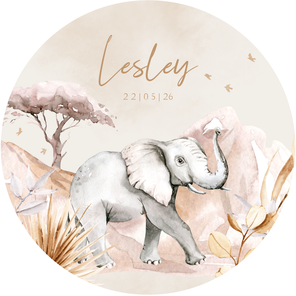 Jungle geboortekaartje voor zowel een jongen als een meisje, in een aparte vorm. Deze babykaart is gesneden in de vorm van een cirkel. Op dit ronde watercolour kaartje Lesley staat een schattige olifant in een berglandschap met een boom en droogbloemen in zachte aquarel aardetinten. Teksten en kleuren pas je eenvoudig aan in onze editor. Hulp nodig? Laat het ons weten!
