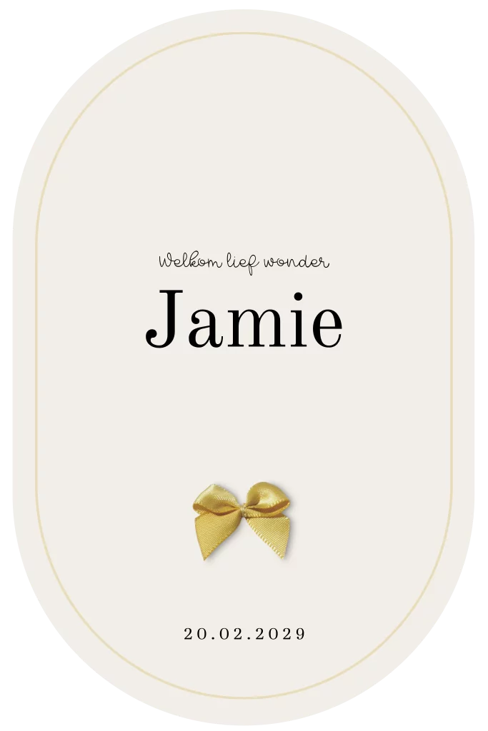 Rustig en neutraal geboortekaartje voor een jongen of meisje in een aparte vorm met echt strikje. Deze babykaart Jamie met een basic design is gesneden in een ovalen vorm. Door de neutrale kleuren is dit originele geboortekaartje zowel geschikt voor een zoon of dochter. Dit geboortekaartje is geïnspireerd op het kaartje van Roos van der Aa. Pas de kleuren en teksten gemakkelijk aan in de editor. Hulp nodig? Bel, mail of chat ons gerust!