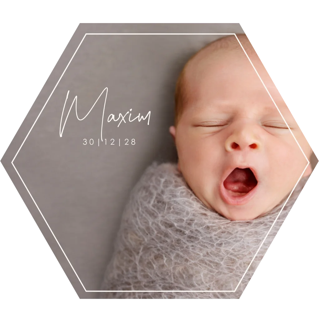 Bijzonder geboortekaartje voor zowel een jongen als een meisje. Deze babykaart Maxim is gesneden in de vorm van een hexagon. Een buitengewoon kaartje voor een uniek wondertje: jullie zoon óf dochter! Op deze kaart alle ruimte voor de liefste foto van jullie baby. Een wit, zeshoekig kader maakt het kaartje helemaal af. Teksten pas je eenvoudig aan in onze ontwerpmodule.
