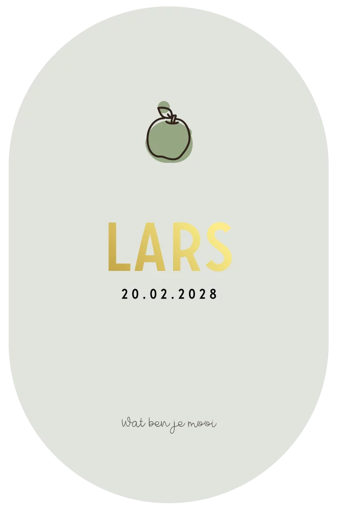 Rustig geboortekaartje voor een jongen in een aparte vorm met fruit, een appel. Deze babykaart Lars met een basic design is gesneden in een ovalen vorm. Door de neutrale kleuren is dit originele geboortekaartje zeker ook geschikt voor een meisje. De goudfolie maakt dit unisex kaartje helemaal af. Pas de kleuren en teksten gemakkelijk aan in de editor. Hulp nodig? Bel, mail of chat ons gerust!