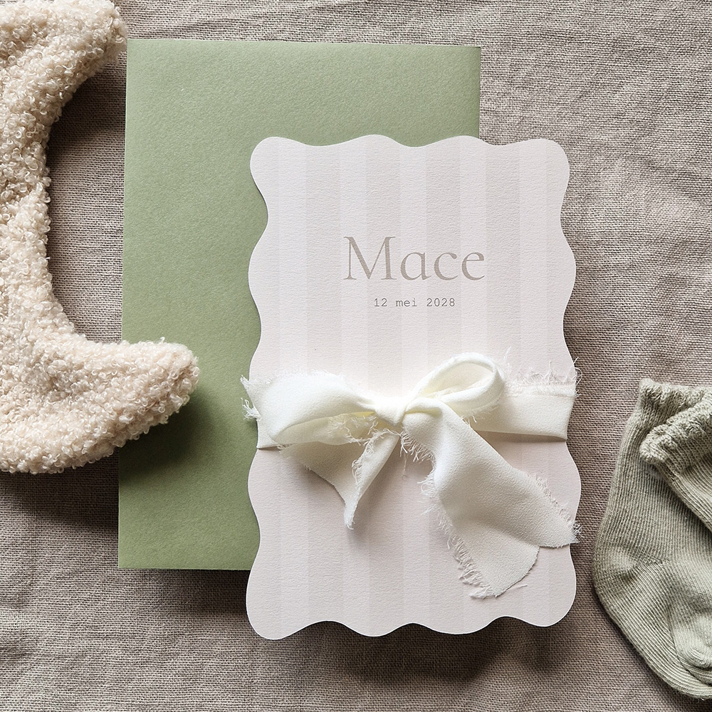 Dit prachtige geboortekaartje is een unieke keuze voor de aankondiging van de geboorte van jullie zoon of dochter. Dit geboortekaartje Mace heeft een aparte vorm, namelijk een uitsnede van golven met een gestreepte achtergrond. Daarnaast is het geboortekaartje verfraaid met een elegant chiffon lint, wat een stijlvolle touch toevoegt. Dit geboortekaartje is perfect voor ouders die op zoek zijn naar iets origineels. Gebaseerd op het geboortekaartje van Sol Rae van Kae Sutherland. Pas de teksten, kleuren en lettertypes eenvoudig aan in de editor en maak het kaartje af met een zand envelopkleur.