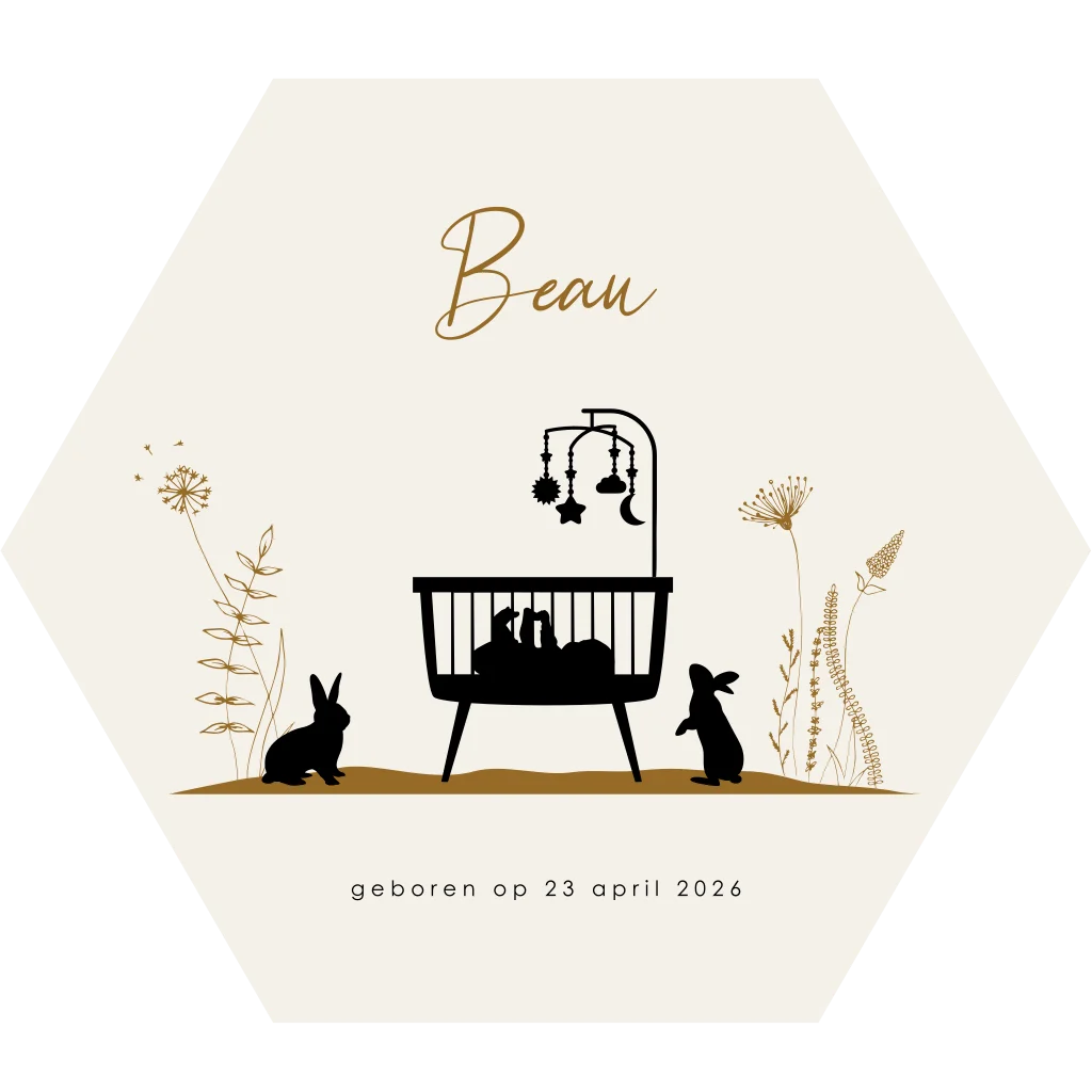 Silhouet geboortekaartje in hexagon vorm met wiegje en konijntjes