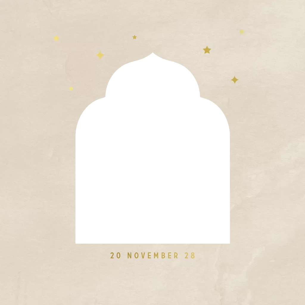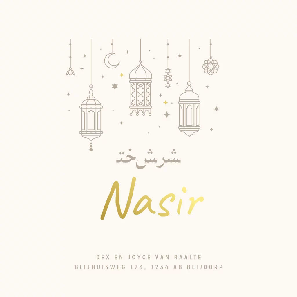 Prachtig unisex geïllustreerd geboortekaartje voor een jongen of meisje. Dit geboortekaartje Nasir heeft een luxe en stijlvol ontwerp door de uitsnede en het gebruik van goudfolie. De uitsnede heeft de vorm van een moskee en geeft een doorkijkje naar de binnenkant van de kaart waar je olielampjes ziet. Op de voorzijde staan in echt goudfolie sterren. Dit geboortekaartje is perfect voor als je een islamitisch geboortekaartje zoekt met een Arabische look.