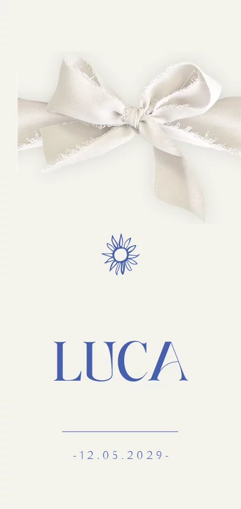 Unisex geboortekaartje voor een jongen of meisje met zon en strik. Dit gender neutrale geboortekaartje Luca heeft een rustige basic uitstraling met witte achtergrond en blauwe teksten en elementen. Door de eenvoud en kleurencombinatie doet dit kaartje denken aan rustige zomers in Griekenland of aan de Middellandse zee, een perfect kaartje voor een zomerbaby dus! Het zijden chiffon lint geeft een luxe en aparte touch aan dit geboortekaartje.