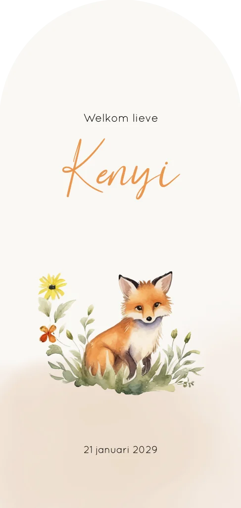 Superschattig geboortekaartje in een boogvorm, geschikt voor zowel een jongen als een meisje. Op dit geboortekaartje Kenyi staat een lief vosje, wat relax in het gras zit rond te kijken. Om hem heen zie je vrolijke bloemetjes.