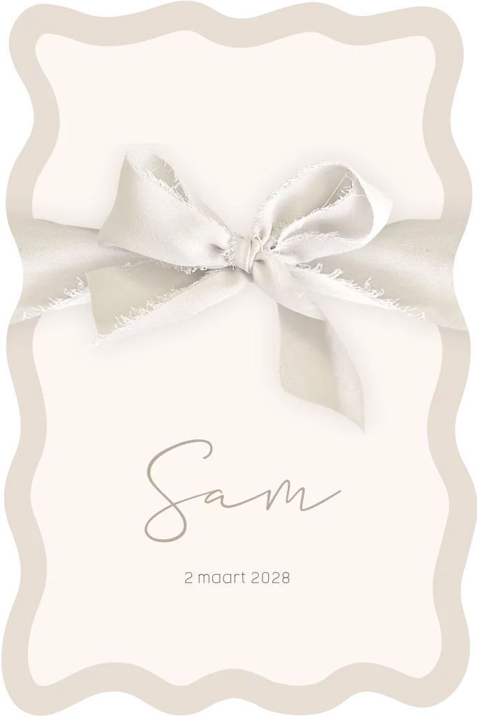 Een stijlvol unisex geboortekaartje voor een jongen of een meisje. Dit geboortekaartje Sam heeft een aparte vorm, namelijk een uitsnede van golven. Binnenin het kaartje zie je ook een golvend kader met de babynaam en geboortedatum. Dit geboortekaartje met neutrale kleurtinten is perfect voor ouders die op zoek zijn naar een origineel kaartje. Gebaseerd op het geboortekaartje van Sol Rae van Kae Sutherland en Jaydi Dubois.