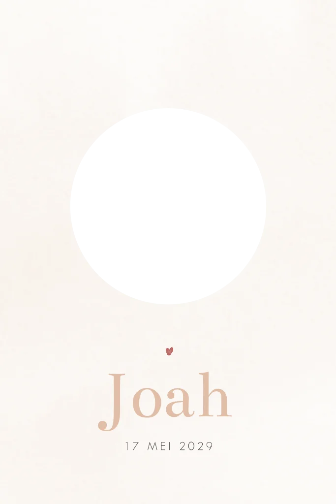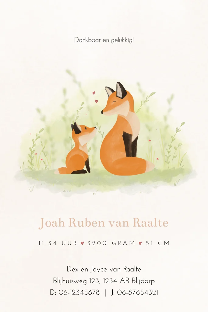 Christelijk geboortekaartje voor zowel een jongen als een meisje. Aan de binnekant staat een bijbeltekst. Dit babykaartje Joah heeft een ronde uitsnede, waardoor je een moeder (of broertje of zusje) vos met haar jong in het gras ziet. Wil je liever andere kleuren, afbeeldingen of teksten? Dat pas je eenvoudig aan in onze editor. Vragen of hulp nodig? Laat het ons weten!