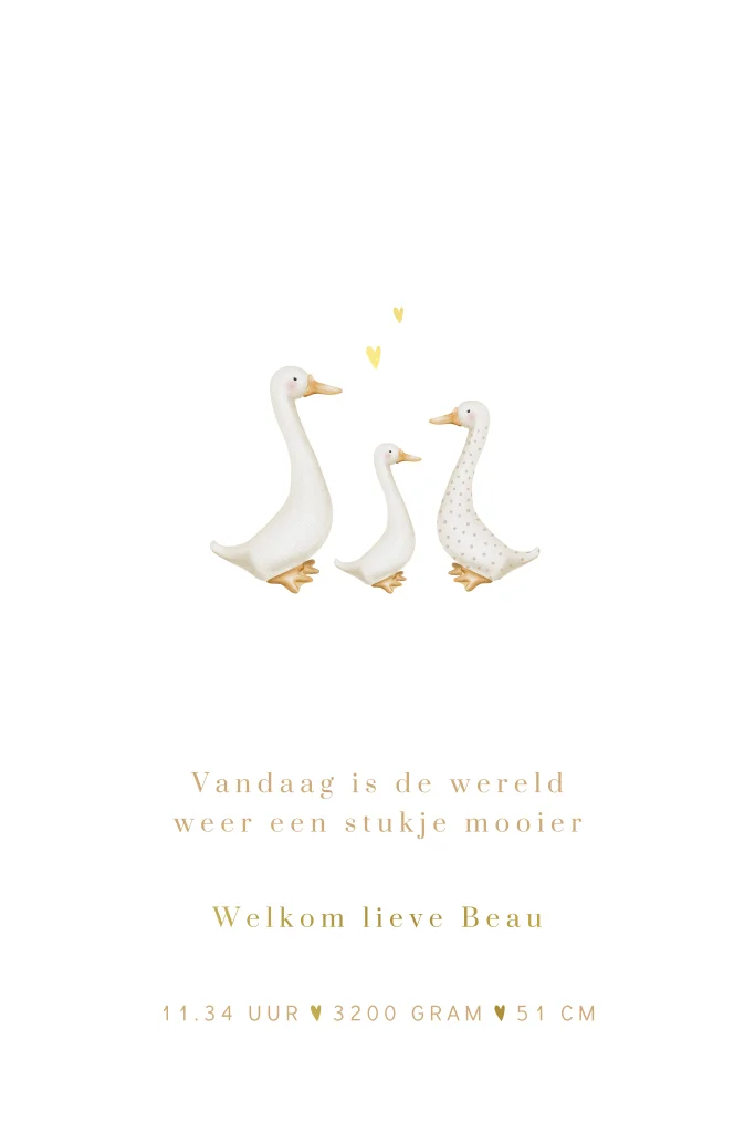 Op zoek naar een origineel geboortekaartje, net wat anders dan de rest van de babykaartjes? Kies dan voor dit rustige nude geboortekaartje Beau, geschikt voor zowel een jongen als meisje. Op dit gender neutrale geboortekaartje zie je drie geïllustreerde gansjes met hartjes. De goudfolie geeft, samen met de ronde uitsnede, een luxe uitstraling aan dit rustige kaartje.