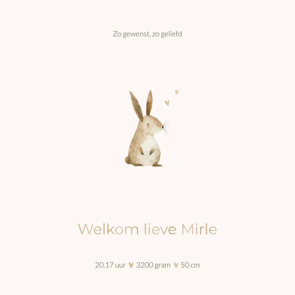 Luxe genderneutraal geboortekaartje met konijn, uitsnede en hoogglans