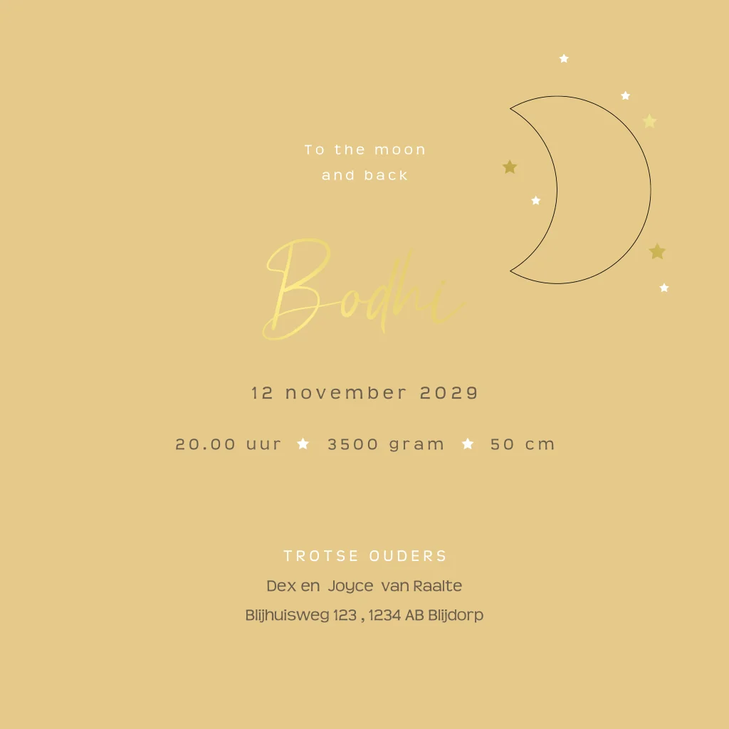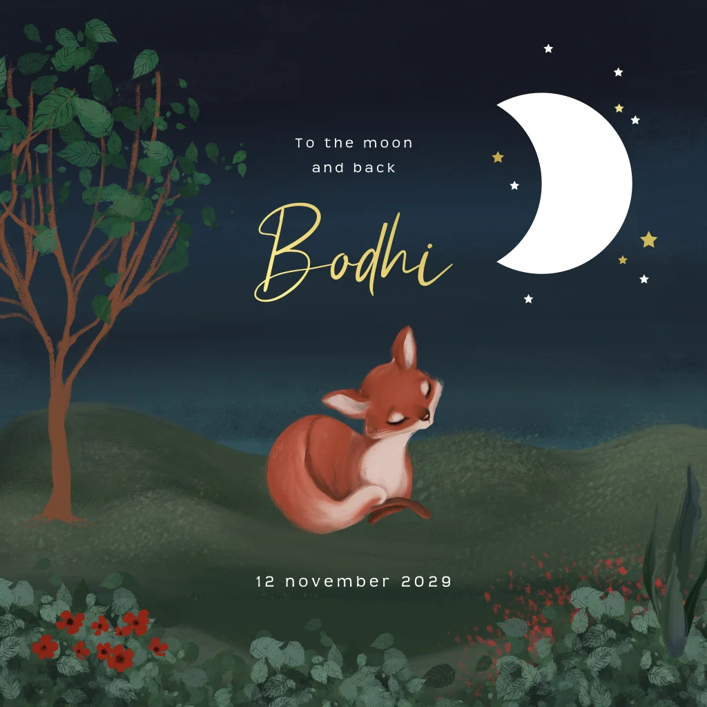 Luxe geboortekaartje voor een jongen of meisje. Op dit unieke geboortekaartje Bodhi zie je een vosje liggen in het bos. Op de achtergrond een blauwe nachthemel met maan en sterren. Het speciale aan deze kaart is dat de maan is uitgesneden en dus een mooi doorkijkje geeft naar de binnenkant. De gouden foliedruk maakt de kaart helemaal af en geeft een luxe uitstraling aan dit gender neutrale geboortekaartje. Teksten, kleuren en silhouetten kun je eenvoudig aanpassen in de editor.