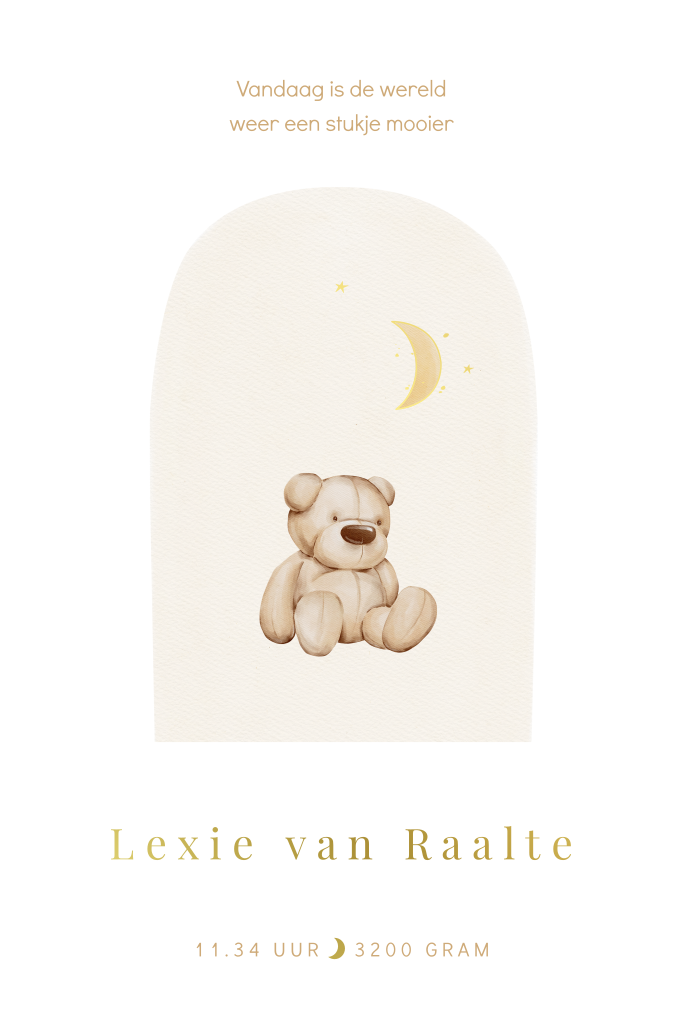Op zoek naar een origineel geboortekaartje? Dan is dit genderneutrale geboortekaartje voor zowel een jongen als meisje zeker geschikt. Dit babykaartje Lexie heeft een doorkijkje naar een schattig teddybeertje met maan en sterren. De uitsnede en goudfolie geven een luxe uitstraling aan dit babykaartje.