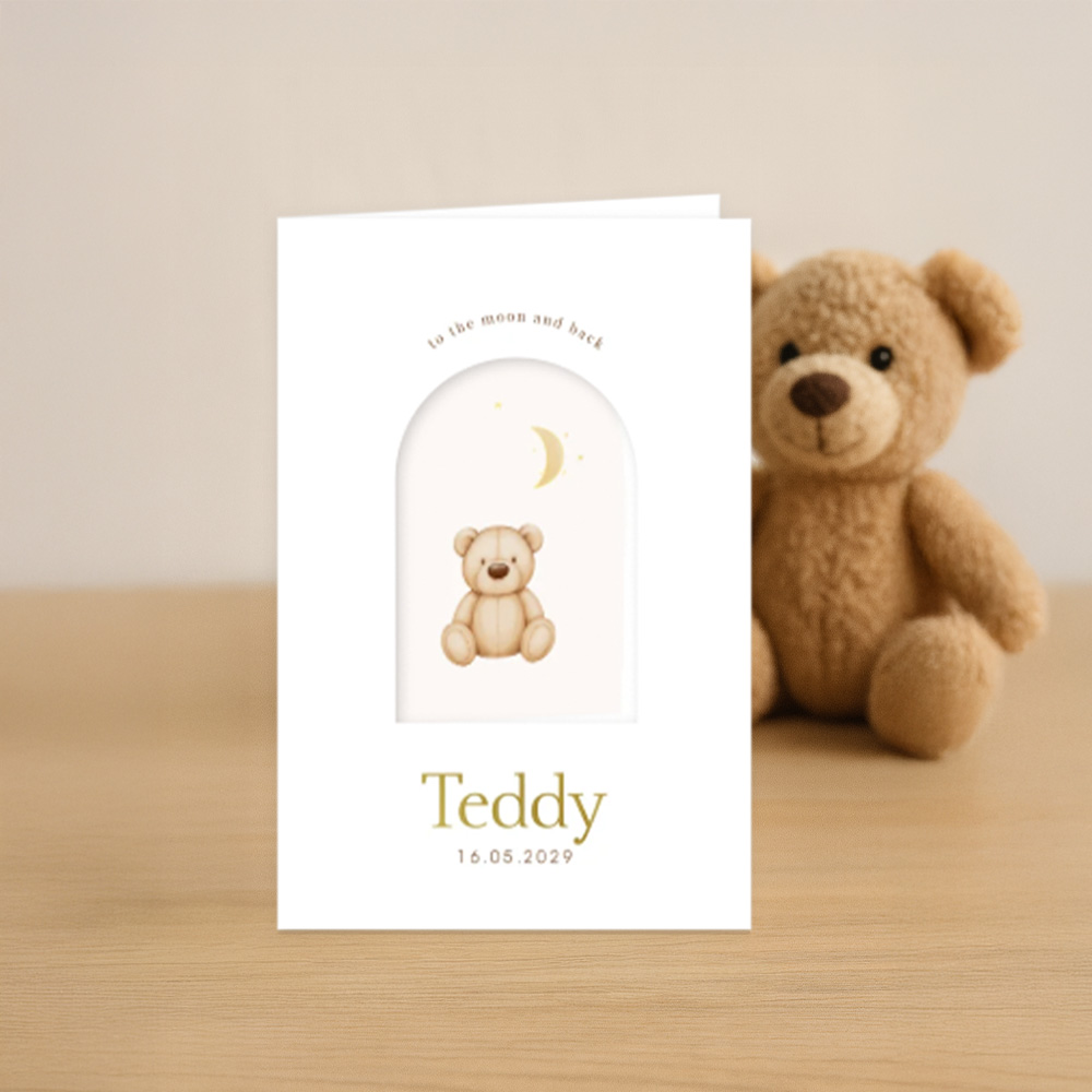 Op zoek naar een origineel geboortekaartje? Dan is dit genderneutrale geboortekaartje voor zowel een jongen als meisje zeker geschikt. Dit babykaartje Teddy heeft een doorkijkje naar een schattig teddybeertje met maan en sterren. De uitsnede en goudfolie geven een luxe uitstraling aan dit babykaartje.
