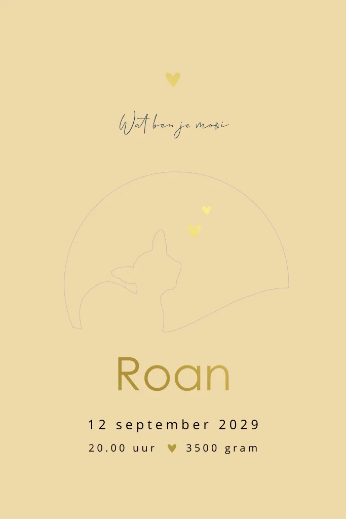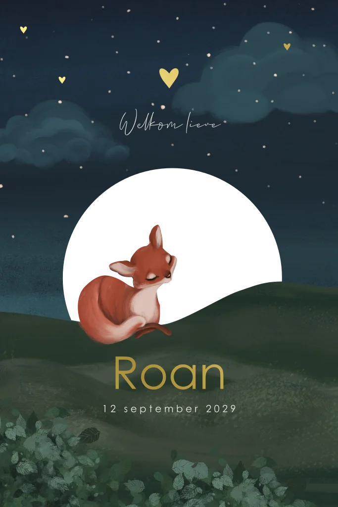 Luxe geboortekaartje met een unieke maan uitsnede en foliedruk! Op dit stijlvolle geboortekaartje Roan zie je een vos afgebeeld in een stijlvol nacht heuvel landschap. Op de achtergrond een prachtige sterrenhemel met maan en hartjes in écht goudfolie. Dit unisex kaartje is perfect voor zowel een jongen als meisje. Teksten, kleuren en silhouetten kun je eenvoudig aanpassen in de editor.