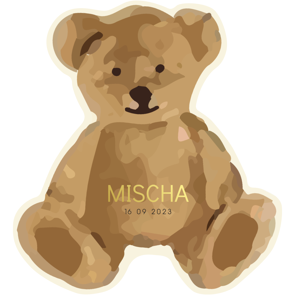 Uniek geboortekaartje in een originele vorm met goudfolie. Dit geboortekaartje Mischa is gesneden in de vorm van een teddybeertje.