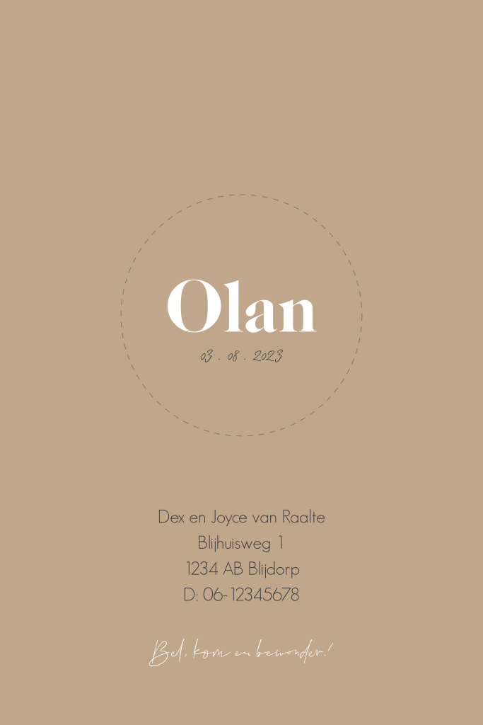 Prachtig geboortekaartje voor een jongen uit de Dotted collectie van Jollein. Dit geboortekaartje Olan heeft stipjes in mooie bruintinten en een rond doorkijkje.