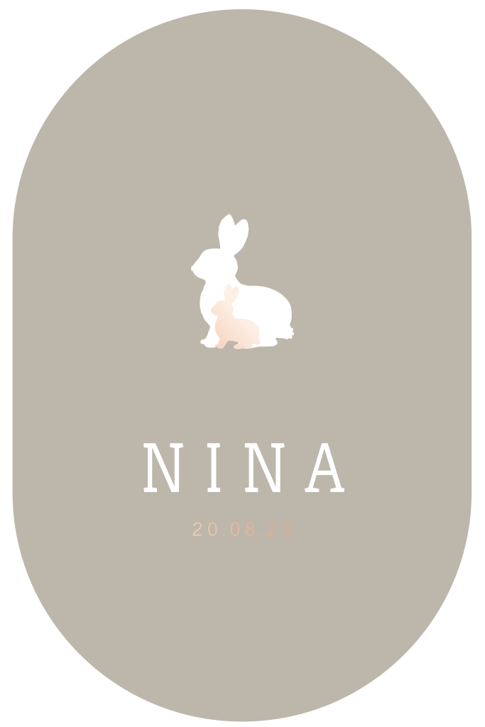 Meisjes geboortekaartje in een bijzondere vorm, met een lief konijntje. Dit babykaartje Nina is gesneden in de vorm van een ovaal. Teksten en lettertypes pas je eenvoudig aan in de ontwerpmodule. Hulp nodig? Laat het ons gerust weten!