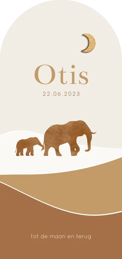 Jongens geboortekaartje in bijzondere vorm. Deze babykaart met de naam Otis is gesneden in de vorm van een boog. Twee olifantjes op een avontuurlijke safari op de Afrikaanse savanne. Er is gebruik gemaakt van warme kleuren in verschillende bruine tinten. Het échte houten maantje maakt het kaartje helemaal af.