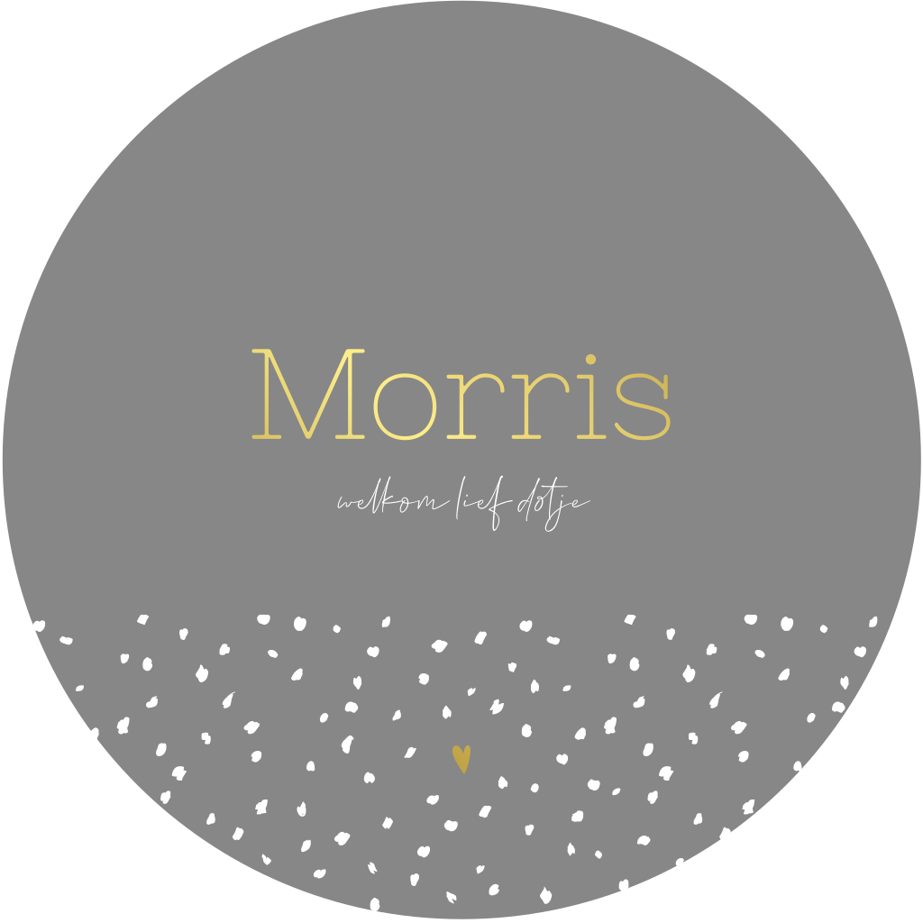 Geboortekaartje voor een jongen in de vorm van een cirkel. Dit ronde kaartje Morris heeft een grijze achtergrondkleur met een rustig stippenprintje. De babynaam en het kleine hartje worden gedrukt in écht goudfolie, dit geeft de kaart een extra luxe uitstraling.