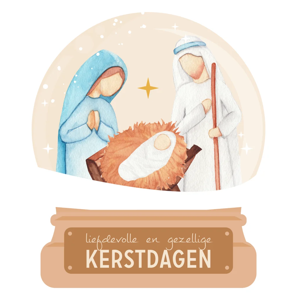 Unieke vorm kerstkaart sneeuwbol met Jozef, Maria en Jezus