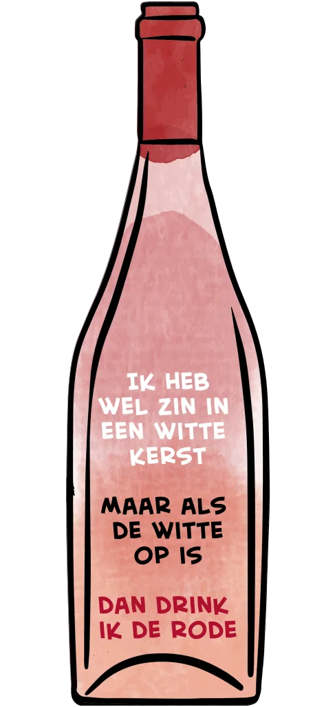 Grappige kerstkaart gesneden in de vorm van een wijnfles met grappige tekst. Stuur deze kerstkaart naar vrienden en familie die ook wel van een wijntje houden en wens ze een fijne kerst en gelukkig nieuwjaar.
