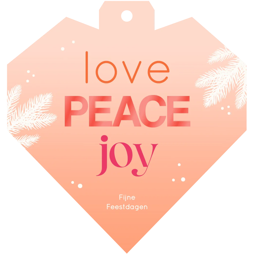 Luxe kerstkaart in de vorm van een geometrisch hart met de tekst 'Love, peace, joy'. Wens met deze hippe kerstkaart vrienden en familie fijne feestdagen. Bijzonder aan deze sprankelende kaart is de aparte vorm. Dat geeft deze kaart een luxe uitstraling. Pas de teksten en kleuren naar je eigen wensen aan in de editor. Hulp nodig? We helpen je er graag bij.