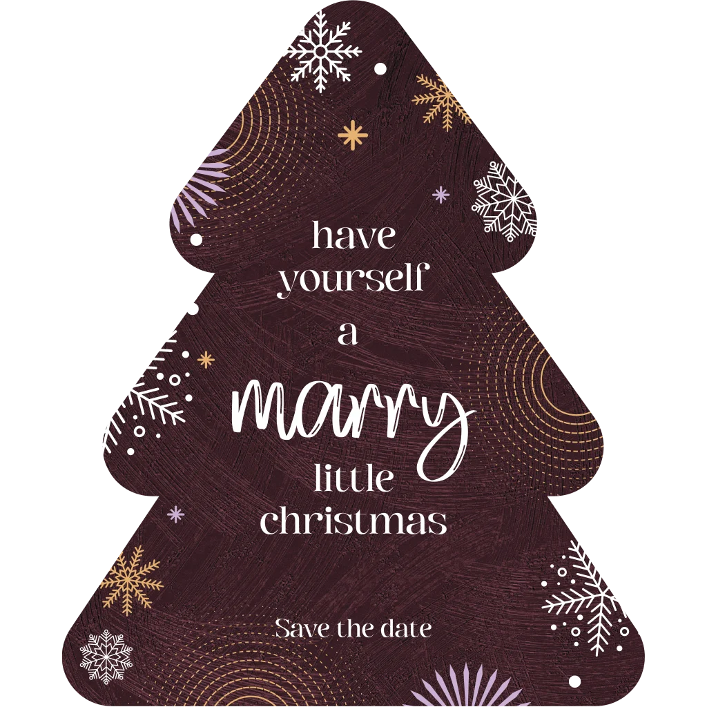 Wens familie en vrienden een Marry little Christmas en vraag ze meteen de datum van jullie voorgenomen huwelijk vrij te houden. Deze Save the Date kerstkaart wordt gesneden in de vorm van een kerstboom. Op de paarse achtergrond feestelijke sterren en ijskristallen. Pas de teksten en lettertypes gemakkelijk aan in de editor.
