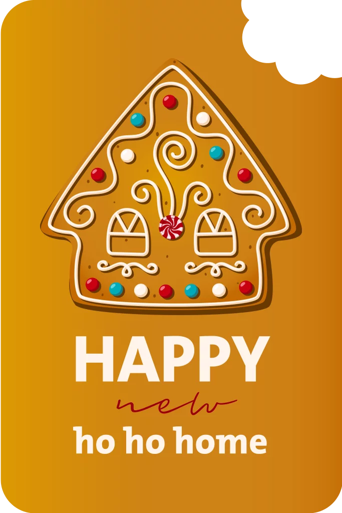 Een grappige kerstkaart in aparte vorm. Je ziet een koekjeshuisje met daaronder de tekst 'Happy new ho ho home'. Uit de kaart is een hapje gehaald, iemand had honger! Wens met deze originele kerstkaart je vrienden en familie fijne feestdagen en verkondig hiermee dat jullie een nieuw huis hebben. Kleuren en teksten pas je eenvoudig aan in onze ontwerpmodule. Hulp nodig? Wij helpen je graag verder.
