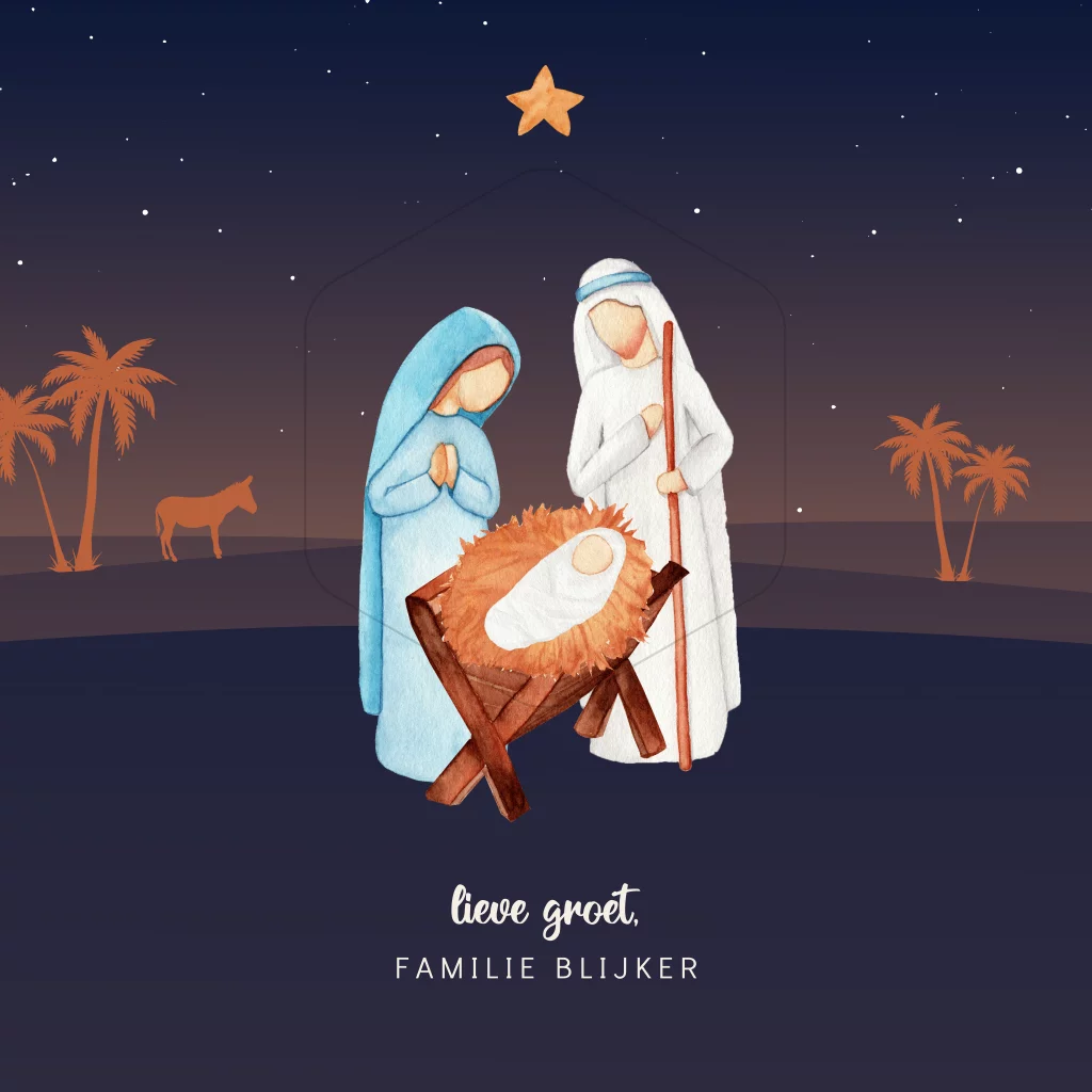 Ben je op zoek naar een bijzondere en luxe christelijke kerstkaart? Kies dan voor deze kerstkaart met trendy kleuren en uitsnede. Deze kaart is perfect om je familie en vrienden een gezegende kerstdagen te wensen. Op de kaart staat een mooie aquarel van Jozef, Maria en kindeke Jezus onder een sterrenhemel.