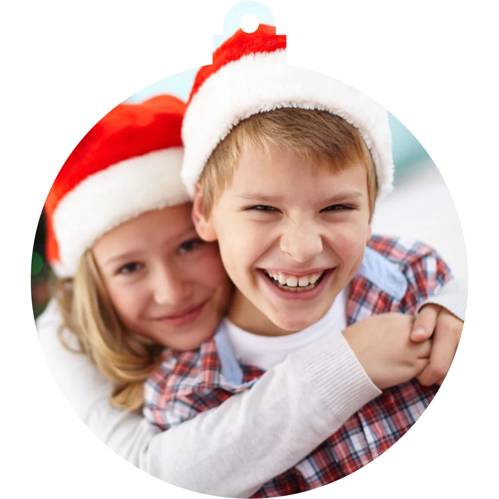 Originele kerstkaart in de vorm van een kerstbal met persoonlijke foto