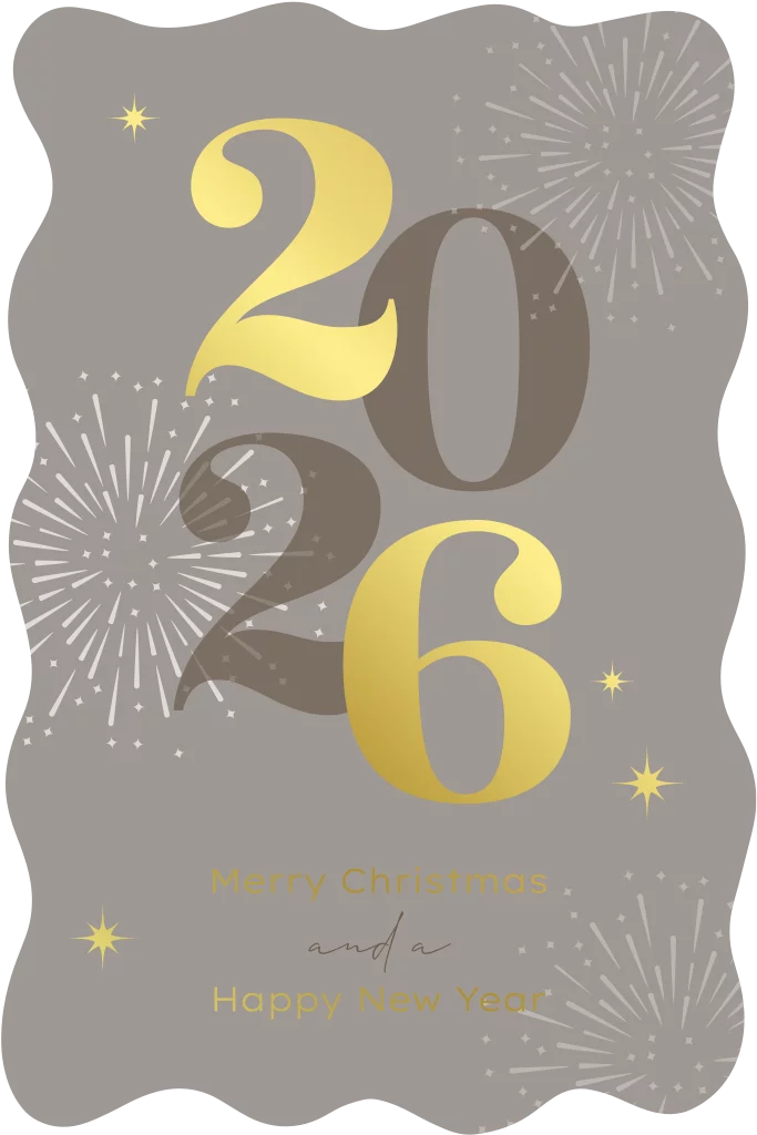 Een prachtige kerstkaart met een aparte vorm. De rand van deze kaart is vormgegeven in een speelse organische vorm. Op deze kaart zie je het jaartal 2026 staan met daaromheen sterretjes en vuurwerk. Verder is er gebruik gemaakt van goudfolie op beide kanten van de kaart. Goudfolie zorgt voor een extra vleugje luxe. Maak de feestdagen onvergetelijk voor je zakelijke relaties met deze originele kerstkaart.