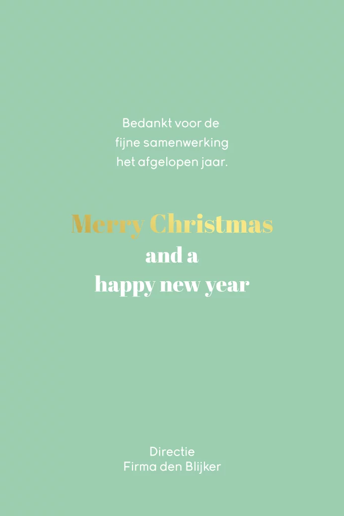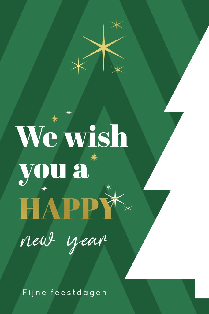 Hippe zakelijke kerstkaart met de tekst ´We wish you a happy new year´. Aan de zijkant van deze kaart zie je een uitsnede van een halve kerstboom. Deze prachtige kerstkaart heeft groene kleuren in een streepjespatroon. De uitsnede van de halve kerstbom geeft een doorkijkje naar de binnenkant van de kaart. Deze kerstkaart is geschikt voor alle branches en is voorzien van goudfolie. Folie zorgt voor een extra luxe uitstraling. Voor elke verkochte kaart doneert Blijkaartje daarom €0,20 aan het Ronald McDonald Huis Zwolle. Hulp nodig met ontwerpen? Neem gerust contact met ons op. Ons team helpt je graag!