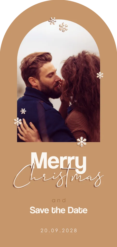 Merry Christmas and Save the Date. Prachtige winterse Save the Date kerstkaart in aparte vorm, een boog vorm. Zet in het frame een foto van jullie als stralend stel en laat iedereen hiermee weten dat jullie gaan trouwen! De strakke en sierlijke lettertypes en de ijskristallen maken de kaart helemaal compleet.