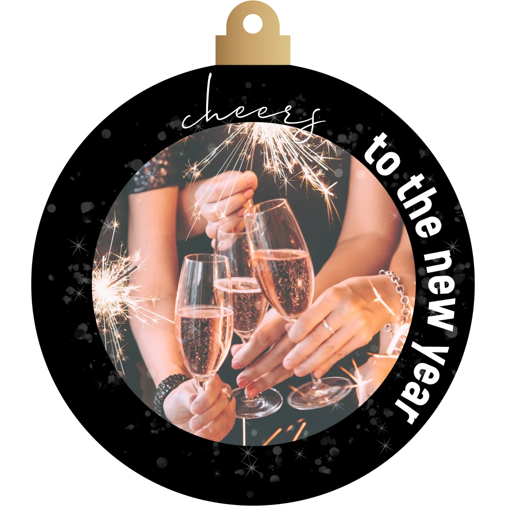 Vier de feestdagen met een unieke zakelijke kerstkaart in de vorm van een kerstbal met een sprankelende champagne foto!