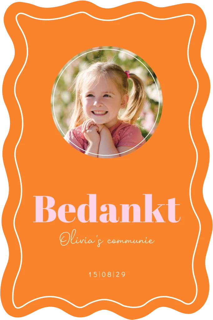 Een prachtige kleurrijke bedankkaart voor een communie. Bedank de mensen die naar de communie zijn gekomen met deze opvallende bedankkaart. De kaart heeft een golvende vorm. Voeg een eigen foto toe van de communicant in de online editor. De lichtroze envelop maakt deze bedankkaart helemaal in stijl af.
