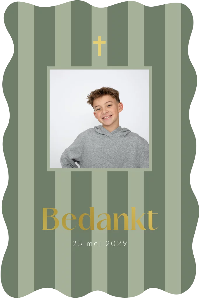 Deze prachtige bedankkaart voor een vormsel heeft een golvende vorm en donkergroen met lichtgroene strepen. Dit kaartje is afgewerkt met luxe goudfolie wat dit kaartje extra speciaal maakt. Zet in het kader een foto van jezelf om de uitnodiging extra persoonlijk te maken.