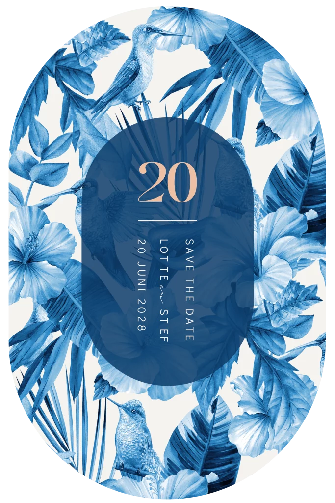 Deze save the date uitnodiging is vormgegeven in prachtige Delfts blauwe kleurtinten! De ovale vorm en het stijlvolle ontwerp maken deze save the date kaart een echte eyecatcher. Op deze kaart zie je kolibries en bloemen met in het midden een donkerblauw ovaal kader met teksten. Kleuren, teksten en lettertypes kun je aanpassen in de online editor. Maak deze kaart af met een bijpassende envelop en sluitzegel. Deze save the date kaart past bij de Delfts blauwe trouwhuisstijl.