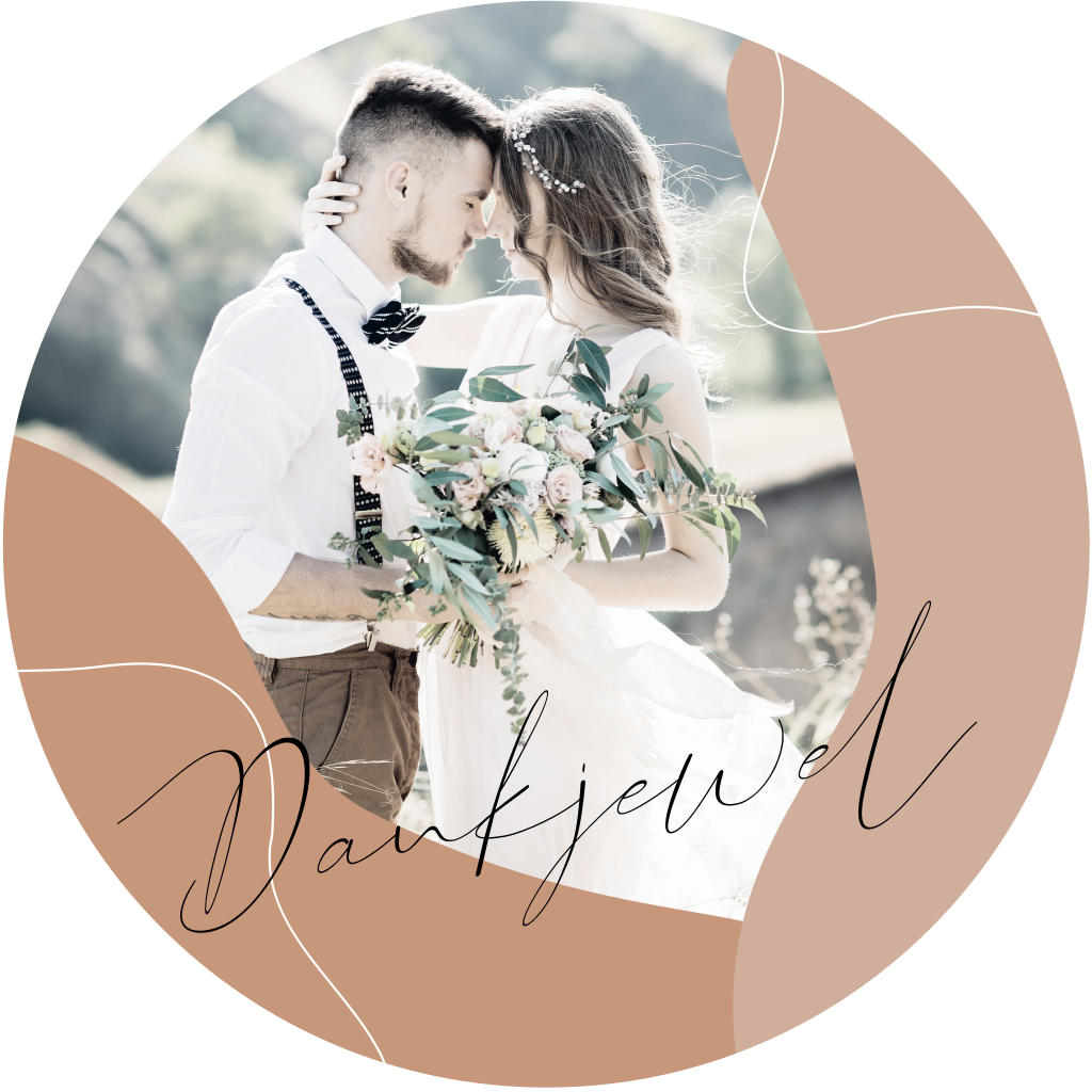 Wil je je gasten op een unieke manier bedanken voor hun komst op jullie onvergetelijke trouwdag? Kies dan voor deze prachtige bedankkaart, welke is gesneden in de vorm van een cirkel. Op deze ronde bedankkaart met abstracte vormen in aardetinten, een prachtige foto van jullie als stralend bruidspaar.