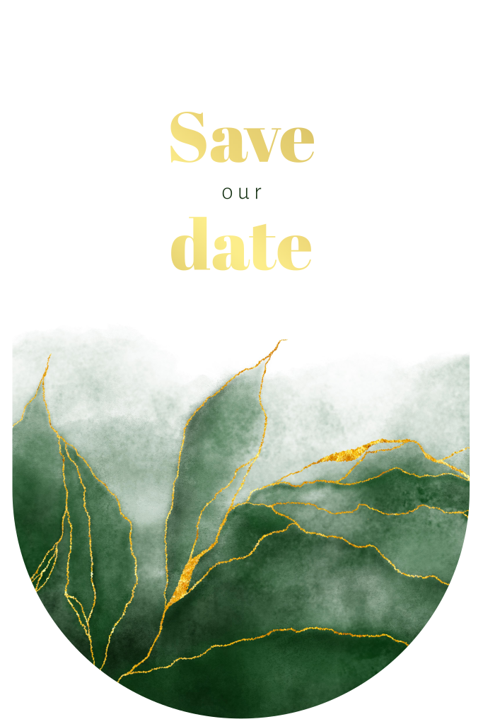 Schitterende Save the Date kaart in bijzondere vorm. Deze kaart is gesneden in de vorm van een ovaal. Op deze kaart elementen in goudfolie. De kleur van de foliebedrukking kun je in de ontwerpmodule aanpassen. Verder op deze Save the Date kaart botanische bladeren met goudkleurige nerven.