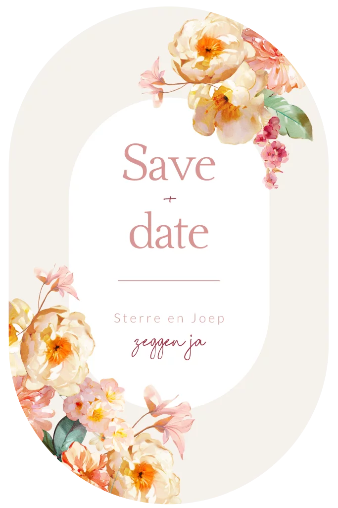 Deze Save the Date uitnodiging is vormgegeven in prachtige zachte pastel kleurtinten. De ovale vorm en het romantische ontwerp maken deze Save the Date kaart een echte eyecatcher. Op deze kaart zie je waterverf bloemen met in het midden een licht ovaal kader met teksten. Deze Save the Date kaart hoort bij de trouwset romantic peach, zo kun je deze gehele stijl doorvoeren in je bruiloft. Kleuren, teksten en lettertypes kun je aanpassen in de online editor. Maak deze kaart af met een bijpassende envelop en sluitzegel.