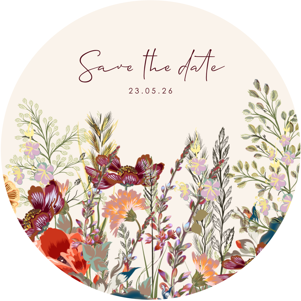 Deze kleurrijke Save the Date kaart is gesneden in de vorm van een cirkel. Op deze ronde kaart verschillende bloemen, wat een fleurig sfeertje geeft.