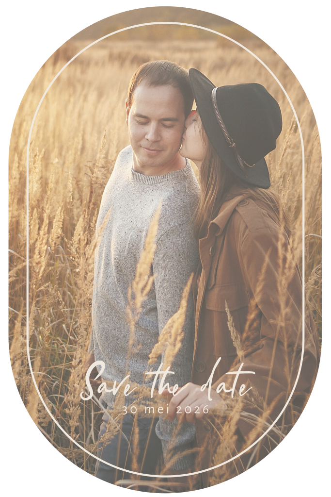Save the Date, want jullie gaan trouwen! Deze unieke Save the Date kaart is gesneden in een ovale vorm. Jullie eigen foto staat centraal. Deze is transparant gezet, wat het net wat romantischer maakt. Een dun wit kaderrandje maakt het kaartje helemaal af.