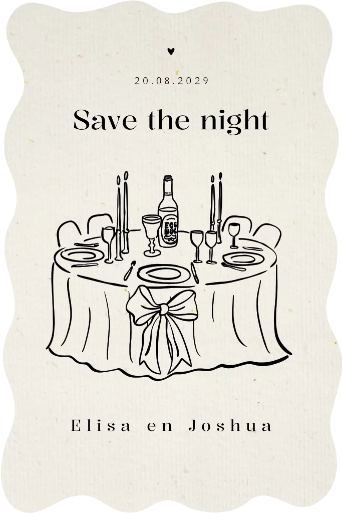 Deze aparte Save the Night uitnodiging is een unieke keuze voor de aankondiging van jullie huwelijk. Deze Save the Date uitnodiging heeft een aparte vorm, namelijk een uitsnede van golven met een neutrale beige papierlook achtergrond. Daarnaast is deze bruiloftsuitnodiging verfraaid met een elegante lijntekening van een gedekte bruidstafel, met wijnglazen, wijn en kandelaars. Deze uitnodiging is perfect voor stellen die op zoek zijn naar iets origineels.